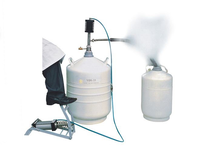 該產品依靠操作者手捏吸液球(ZYB-5型)或者腳踏氣缸(ZYB-8型),使液氮容器內貯存的液氮少量產生氣化。由于液氮的氣液體積比較大,氣化后的氮氣在密封的容器內對盛裝的液氮增壓,促使容器內盛裝的液氮排放出來,達到對其它容器補充液氮的目的。它具有操作方便可靠、排液過程中液氮的蒸發(fā)損失低的優(yōu)點。其中,ZYB-8型自增壓式液氮泵已獲得國家實用新型專利保護,專利號:ZL 03 2 77135.5。
